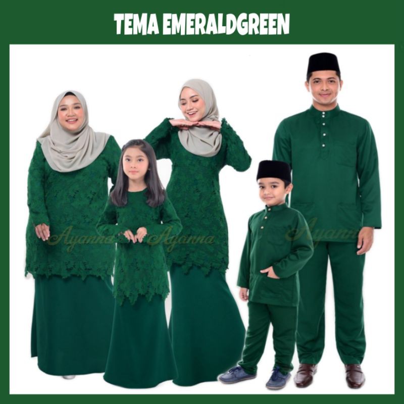 Baju raya sedondon tema warna emerald green (hijau) set family ayah ibu anak baju kurung baju melayu kurta.